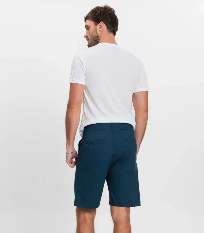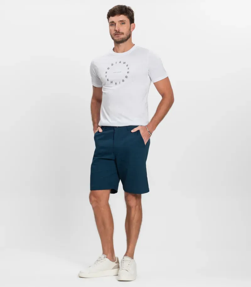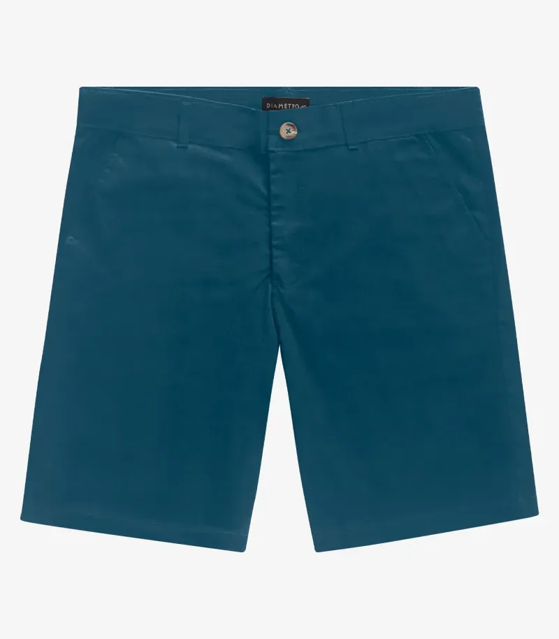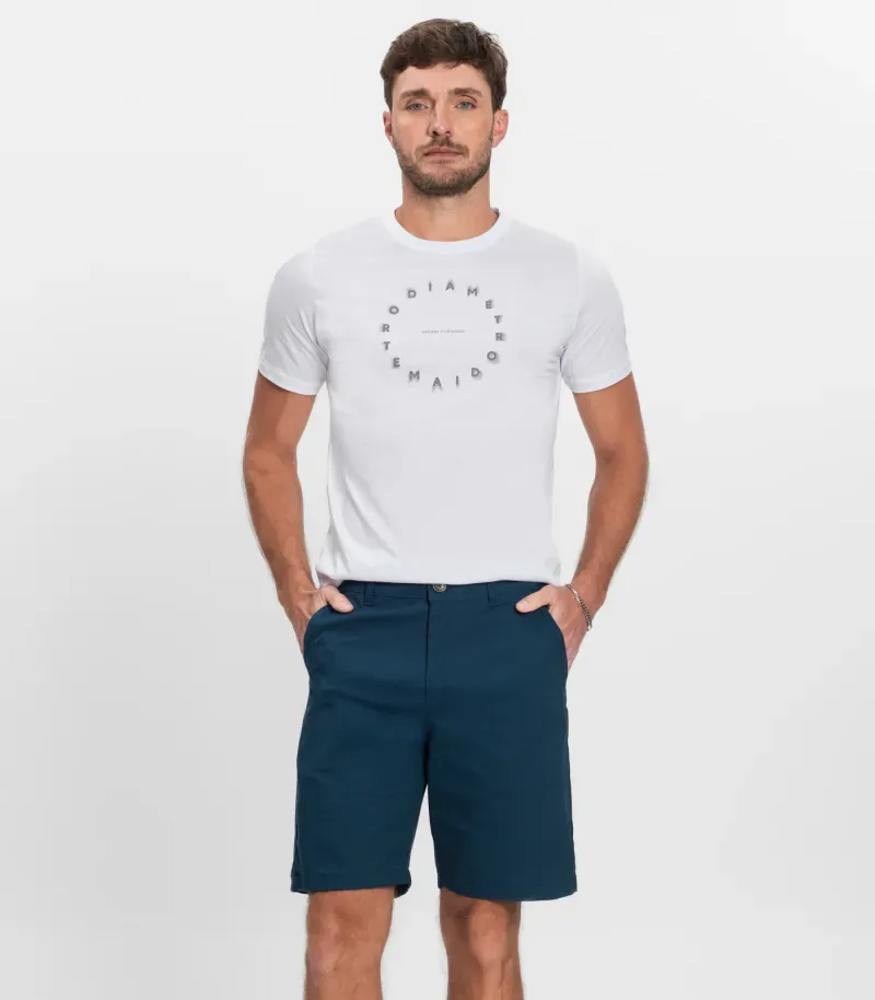 Bermuda Masculina Diâmetro confeccionada em sarja de alta qualidade, com cós reforçado e passantes para cinto. Possui braguilha com zíper, botão e travetes de segurança. Conta com bolsos frontais e dois bolsos traseiros funcionais. Acabamento com costura pespontada em toda a peça, pences nas costas para melhor caimento e barra com bainha tradicional. Ideal para quem busca conforto e estilo no dia a dia.