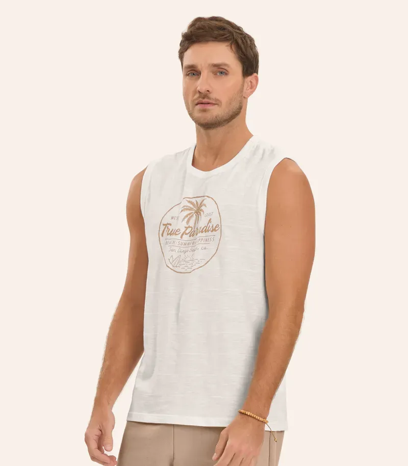 Machão Masculino Diametro, confeccionado em meia malha flamê maquinetada de toque leve e confortável. Modelo de base lisa com estampa central na parte frontal, decote redondo e cavas com friso para maior durabilidade. Possui tampografia no decote e barra finalizada com bainha, garantindo acabamento refinado. Peça ideal para compor looks frescos e descontraídos, perfeitos para dias ensolarados e ocasiões casuais.